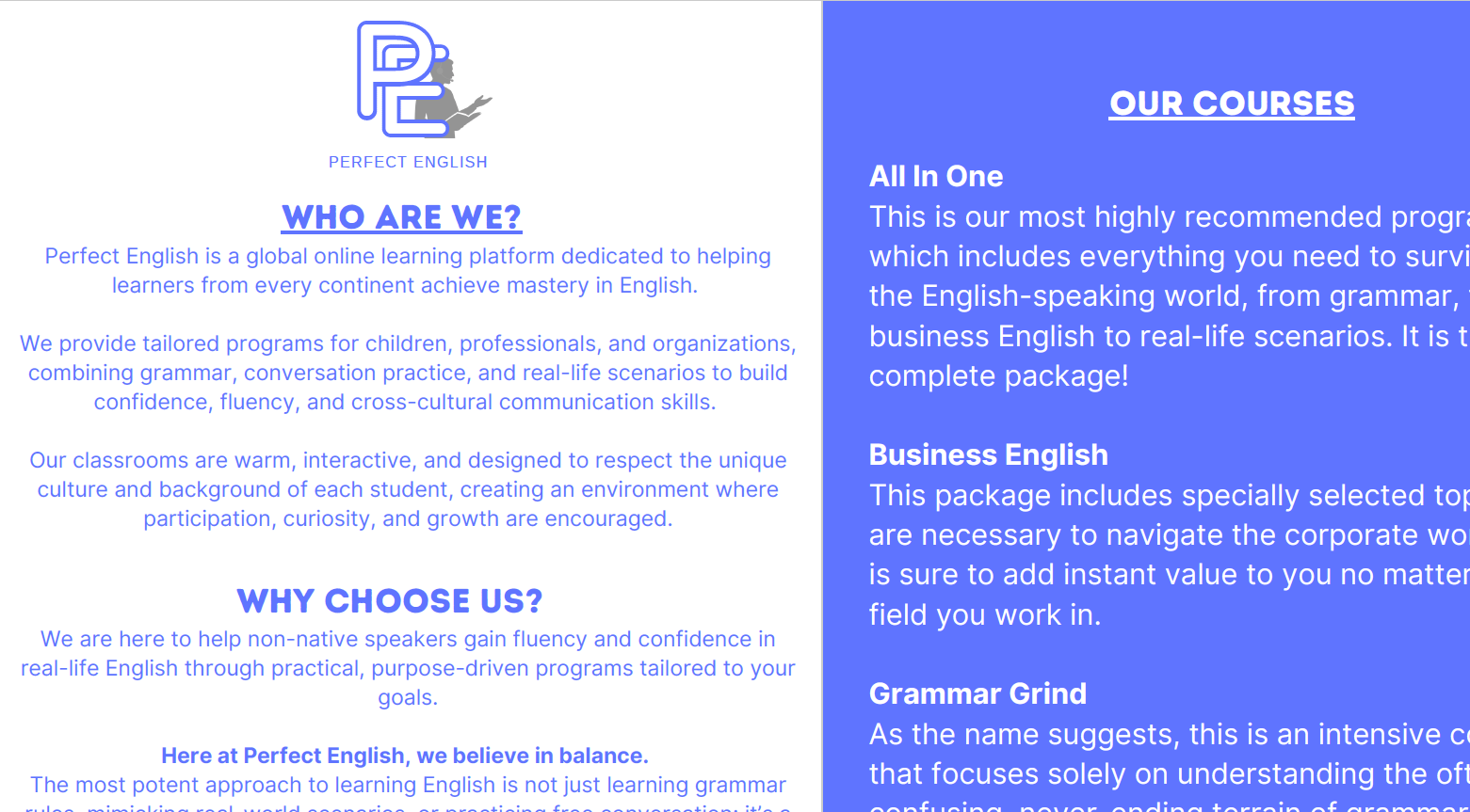Find out moreHere at Perfect English we believe in balance. The most potent approach to learning English is not just learning grammar rules, mimicking real-world scenarios or practicing free conversation; it’s a smart, engaging and well-balanced mix of all these method that yields the best results. And this is exactly what we have curated for you. So, what are you waiting for? Let’s get started!